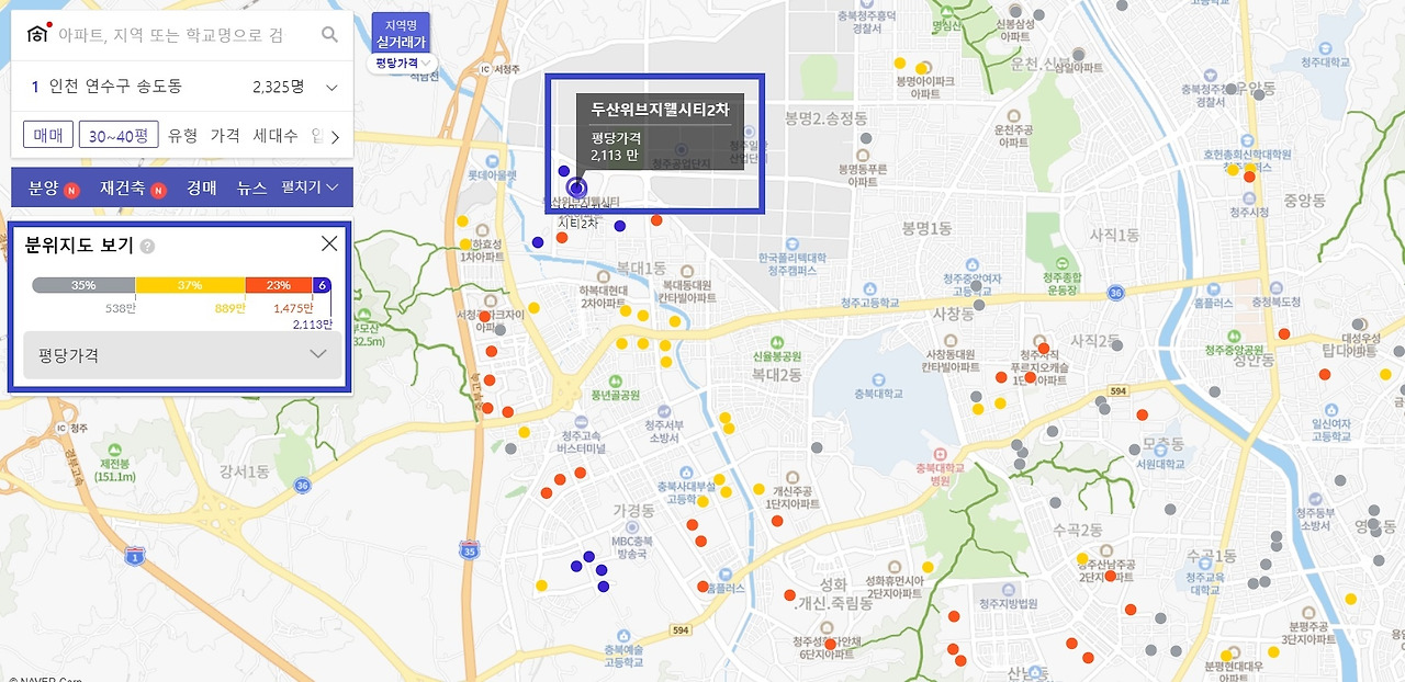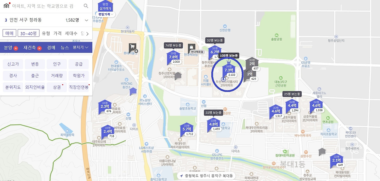 우선 호갱 노노에 접속 후 청주지역으로 지도를 이동합니다.