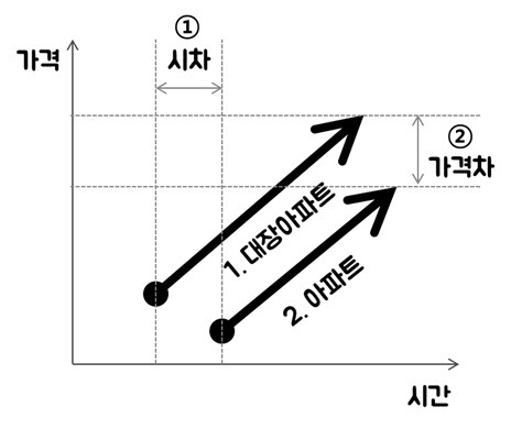 한 지역에 대장 아파트(A)와 일반 아파트(B)의 가격은 각각 10억과 7억이었습니다. 대장 아파트(A)와 일반 아파트(B)는 항상 10:7 비율의 가격차이를 유지하고 있었지요. 그런데 2년 후 상승기를 맞이해 대장 아파트(A)가 먼저 가격이 올라 20억이 되었습니다. 이때, 아직 아파트(B)는 가격이 오르지 않고 그래도라고 가정해봅시다. 아파트 (B)는 향후 얼마까지 오를 수 있을까요? B아파트 인근에 특별한 호재가 있어 입지가 변하지 않는 이상 대장 아파트(A)와 10:7 비율인 14억까지 오를 수 있을 것입니다. 2년 전에 두 아파트의 가격차이는 3억이었지만, 시간이 지나 6억 차이로 벌어질 확률이 크다는 것이지요.