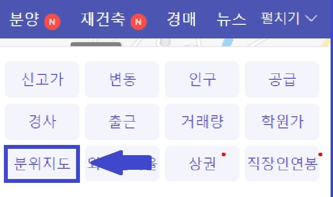 다음은 호갱 노노의 "분석" 탭(펼치기 항목 누르면 나옴)으로 들어가 분 위지도를 클릭합니다.