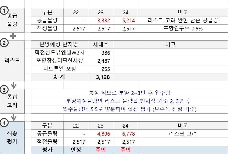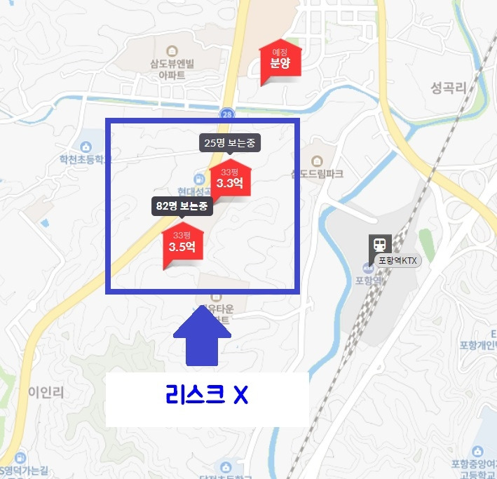 먼저 '아실'앱을 통해 포항지역의 2025년까지 공급물량을 확인해봤습니다. 충격적 이게도 예정된 공급물량이 1도 없다고 나오는군요.. 이렇게 되면 기존의 신축을 위협할 수 있는 '대체체' 성격의 아파트가 한동안 등장할 수 없다는 이야기입니다. 입지와 상품이 좋은 아파트부터 상승하는 것은 당연한 흐름이겠지요. (정석대로 지역분석을 하시려면 미분양이 줄고 있는지 추이부터 확인해야겠지만, 이번 글은 리스크 평가를 위한 글이므로 생략했습니다.)