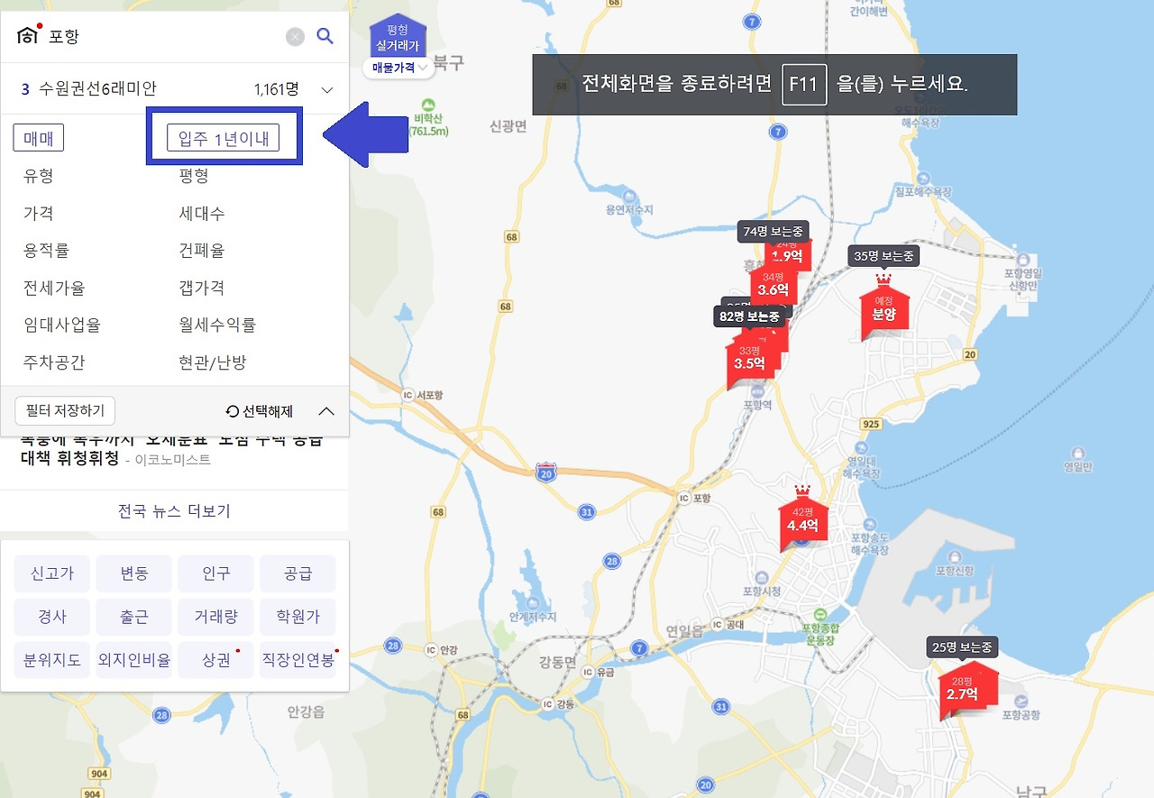 (방법 1) 호갱노노 앱 접속 > '포항시' 지도 이동 > 필터에서 "입주1년이내" 선택