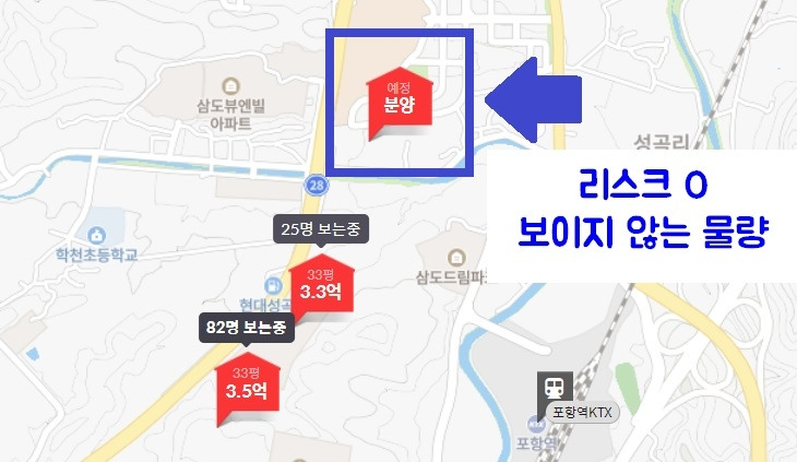 위에 사진에 분양 예정 단지뿐 아니라 포항시 전체에 분양 예정 단지를 찾아 그 단지의 세대수를 모두 더해주면, 포항의 보이지 않던 공급물량인 리스크가 얼마나 되는지 확인해 볼 수 있습니다. 빨간색 집에서 예정 분양이라고 나와 있는 곳은 총 3곳으로 '학천삼도뷰엔빌', '장성이편한세상', '더트루엘포항'이 나왔군요. 이 3개 단지의 예정 세대수를 더해주면 보이지 않는 물량 계산 끝!입니다.
