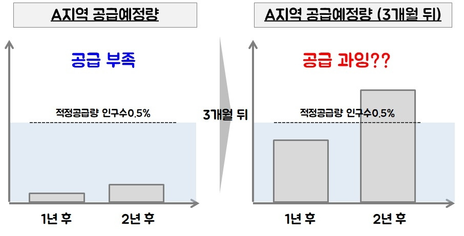 그런데 문제는 내가 그때 확인했을 땐 분명히 공급물량이 없었는데 몇 달 지나고 보니 갑자기 예정에도 없던 공급물량이 3천, 5천 세대 늘어나 있는 경우가 발생할 수 있다는 것 이죠.