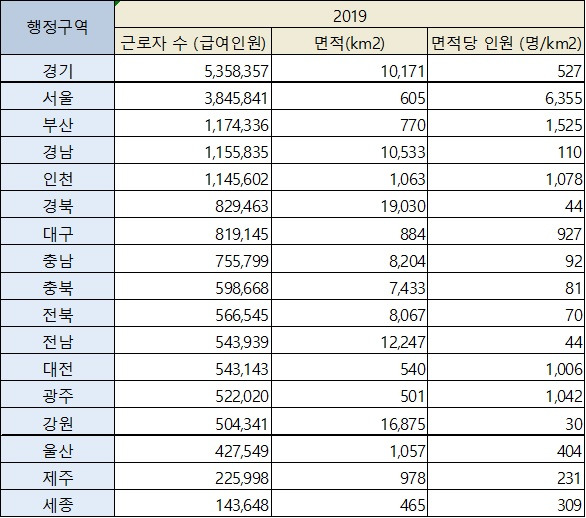 면적당 근로자 수가 인천과 비슷한 대전광역시와 광주광역시도 마찬가지로 보시면 됩니다. 지하철역이 있으면 플러스 요소가 되는 것은 맞지만, 부가적인 요소일 뿐 투자와 실거주를 결정짓는 요소로 평가하게 된다면 오히려 부동산의 가치를 고평가 할 수 있는 요인이 될 수 있으니 주의하셔야 합니다.