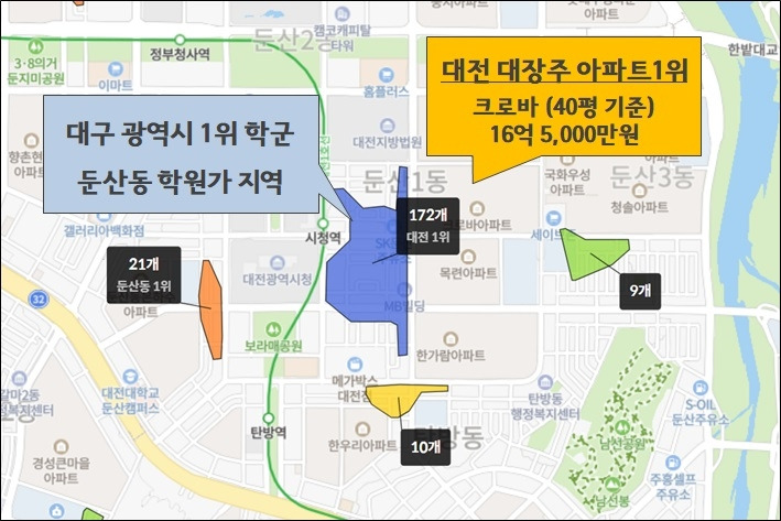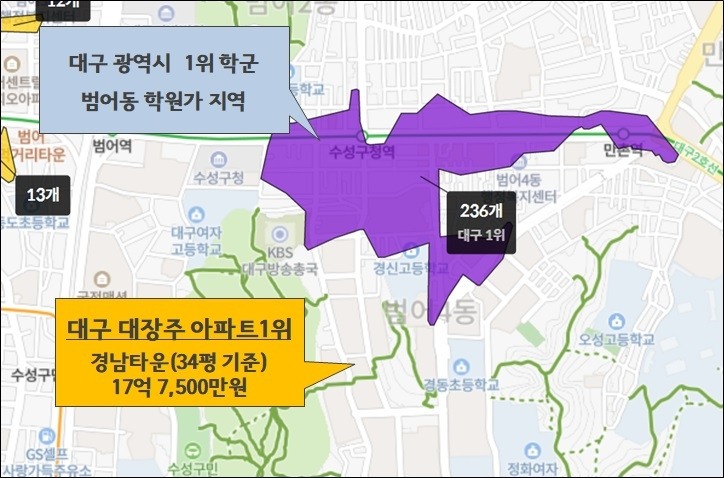 대표적인 예로 아래 대구광역시의 경신고 학군, 범어동 학원가 인근 아파트들을 들 수 있습니다. 대구뿐 아니라 부산을 제외한 4대 광역시 모두 학군 프리미엄이 집값을 좌우하는 최중요 입지 요소로 작용하고 있음을 아래 예시를 통해 알 수 있습니다.