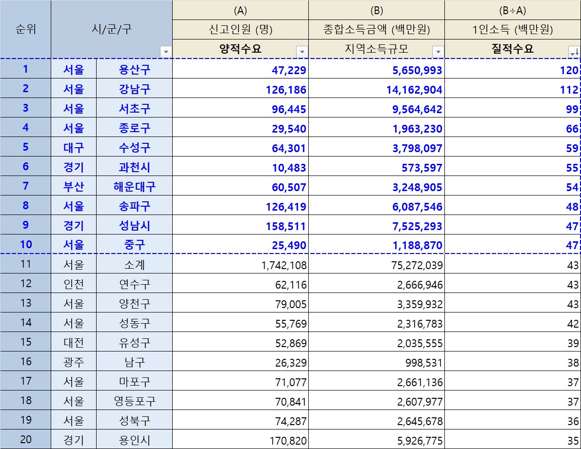 1인 소득 평균 1위가 강남구가 아닌 용산구인 것은 의외였으나, 대형 평수 위주인 '나인원 한남' 입주 영향으로 다수의 기업인들과 셀럽들이 한남동에 몰리며 발생한 결과가 아닐까 추측해봅니다. 하지만 여전히 경제활동인구 규모를 나타내는 '(A)신고인원'과 지역 내 종합소득 규모인 '(B) 종합소득금액'을 모두 고려해봤을 때, "강남구"와 "서초구"가 압도적이라는 것을 다시 한번 확인할 수 있습니다. 서울 이외 1인 평균소득이 높은 부자들이 모여살고 있는 지역은 '대구 수성구', '경기 과천', '부산 해운대구', '경기 성남(판교)'가 있네요.