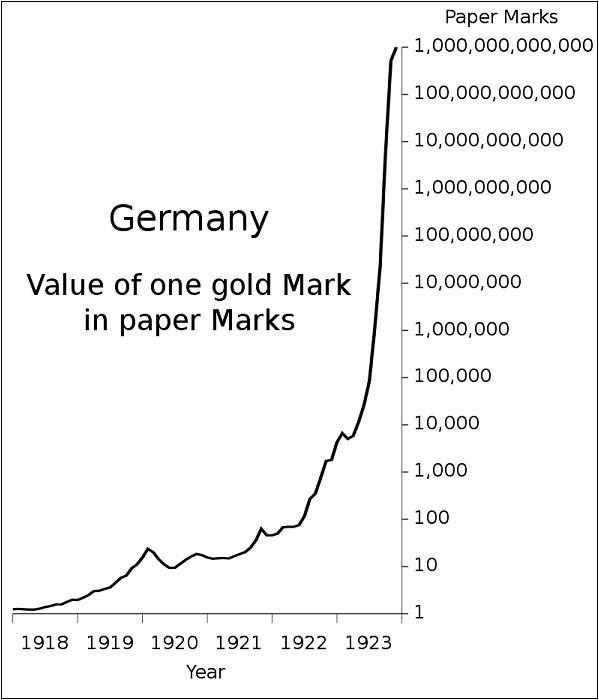 실제로 과거 역사상 세계 각국은 3개 선택지 중 지속적으로 ③ "화폐가치를 낮춘다"를 찍어왔고 그 결과가 현재의 집값인 것이지요. 조금만 예를 들어 볼까요? 제1차 세계대전이 시작되자 각 국은 전쟁을 준비하기 위한 돈이 필요해졌고 그 과정에서 대량의 화폐를 발행했습니다. 전쟁에서 패배한 독일에는 막대한 양의 전쟁 배상금이 부과되었지요. 독일은 이를 갚기 위해 수출을 늘리는 과정에서 엄청난 양의 화폐를 발행합니다.