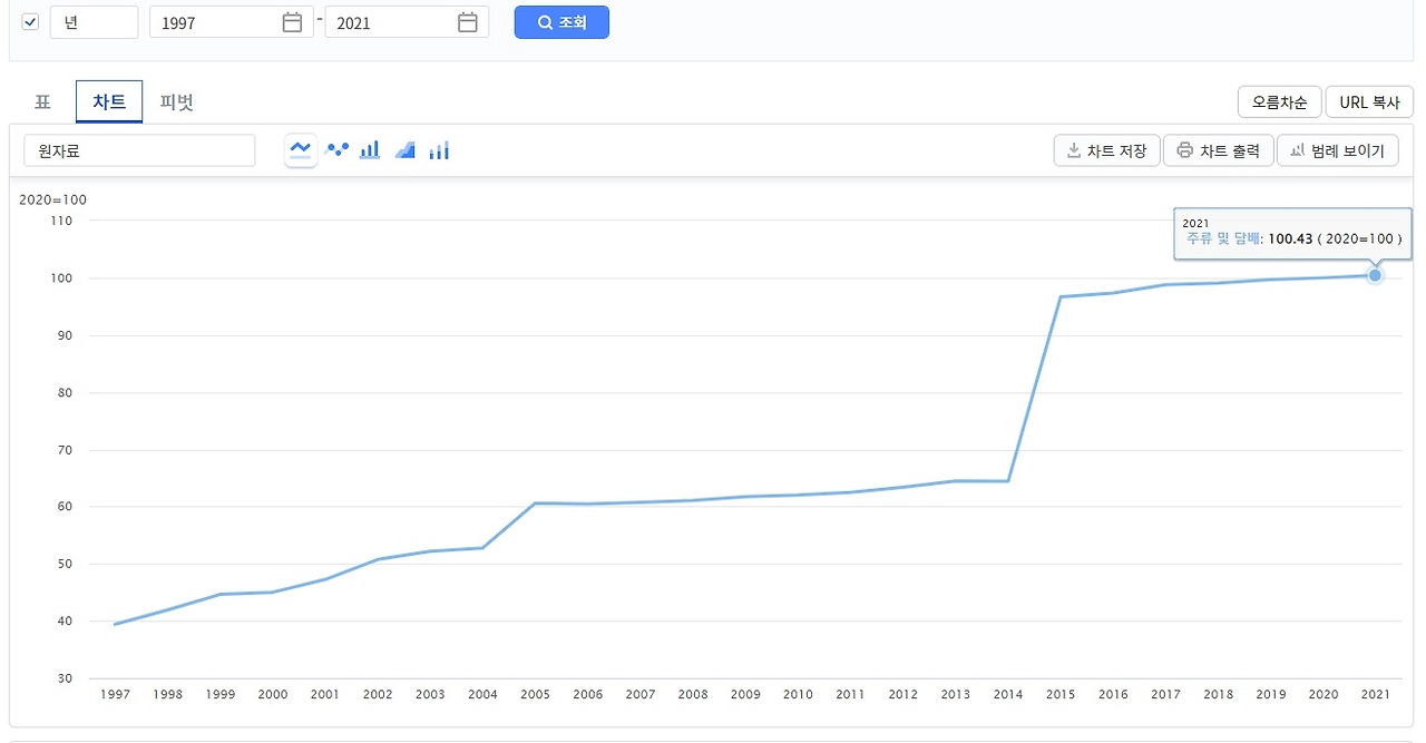 주류 및 담배 물가지수 (1997~2022) (출처 : 한국은행경제통계시스템)