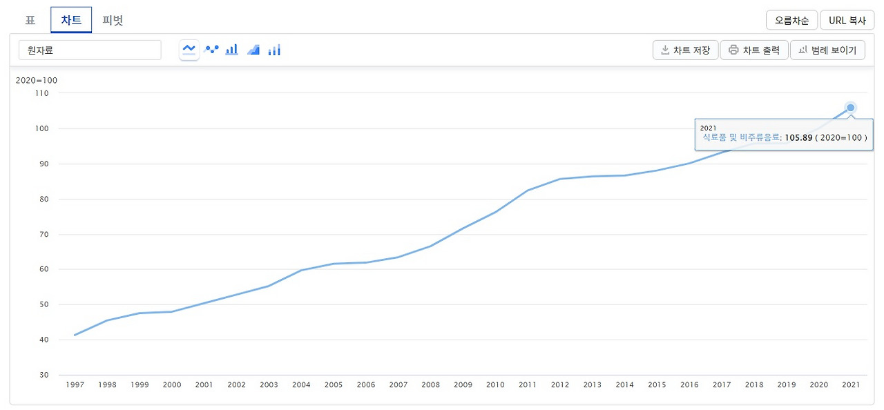 식료품 및 비주류 음료 물가지수 (1997~2022) (출처 : 한국은행경제통계시스템)