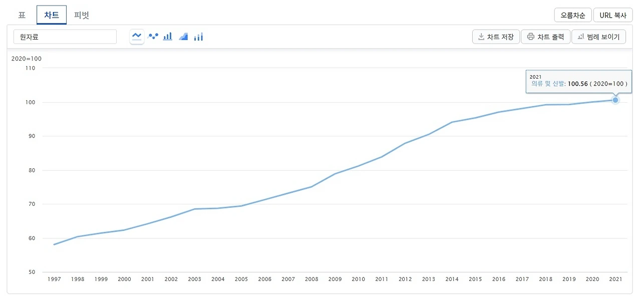 의류 및 신발 물가지수 (1997~2022) (출처 : 한국은행경제통계시스템) 나이키는 세계적으로 최고의 브랜드 중 하나라 그런 거 아니냐고요? 그럼 우리가 매일 먹는 쌀, 반찬이나 술, 담배 가격은 어땠을 까요? 한국은행 통계자료를 찾아보니 아파트와 마찬가지로 이들의 가격 역시 꾸준히 올랐음을 확인할 수 있었습니다. 왜 이런 일이 생겼을까요?