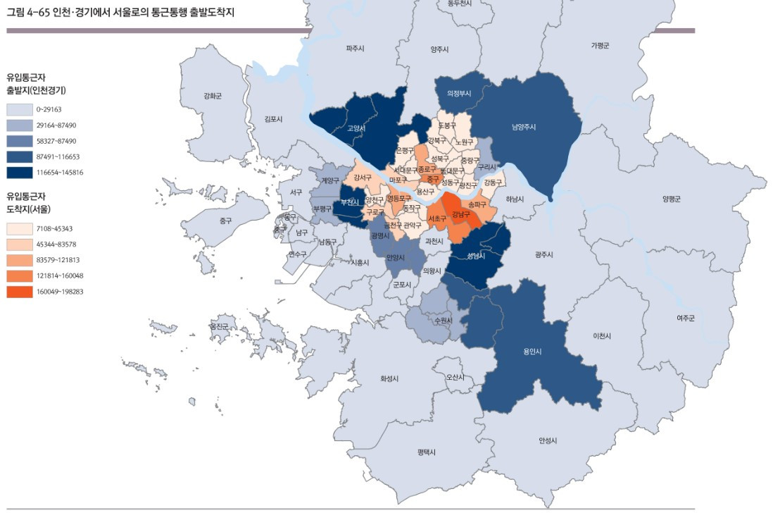 수도권을 예로 들어볼까요? 위의 지도는 서울의 3대 핵심 일자리인 강남, 여의도, 시청으로 출퇴근하는 사람들의 수를 색깔로 표현한 데이터 지도입니다. 푸른색일수록 일자리로 출근하는 사람들이 많은 지역이고, 붉은색 수록 일자리를 많이 보유하고 있어 사람들이 유입되는 지역입니다. 다시 말해 붉은색은 '일자리'라고 하는 수도권의 핵심 수요 동인을 가진 지역입니다. 노른자 지역인 것이죠.