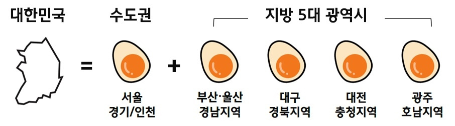 전국은 서울을 중심으로 하는 수도권과 5대 광역시를 중심으로 한 주거 생활권으로 나누어 볼 수 있습니다. 전국을 5개의 반숙란으로 구성되어 있다고 생각해보세요. 각각의 계란 생활권을 얼마나 정확하게 알고 있느냐에 따라 여러분의 부동산 투자 수준이 달라진다고 이야기할 수 있을 만큼 부동산 시장과 입지를 분석하는데 유용하고 중요한 개념입니다.