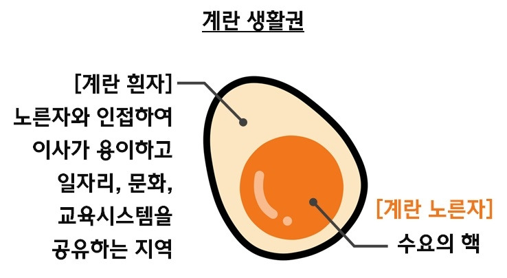 하나의 계란은 하나의 주거 생활권을 의미합니다. 계란이 노른자와 흰자로 구분되어 있듯이 각각의 생활권도 지역 수요의 핵이 되는 핵심 주거지(노른자)와 그 주변에 위치하며 일자리, 문화, 교육 시스템을 공유하는 주거지(흰자)로 이루어져 있지요.