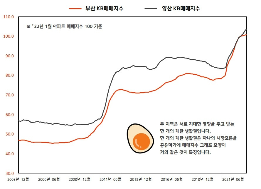 이렇게 가격 그래프를 통해 우리는 부산과 양산은 하나의 계란 생활권이며, ●하나의 계란 생활권은 동일한 시장 흐름을 가지는 것도 확인했습니다. 이런 특징은 부동산 투자 전략과 어떻게 연결될까요?