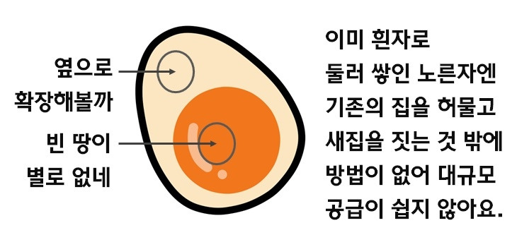 ● 위에 그림을 보면 알 수 있듯 노른자는 이미 흰자들로 둘러 쌓여 있는 지역입니다. 이런 지역들은 위에서 얘기한 두 가지 공급 방법 중, 후자인 정비사업을 통해 공급할 수밖에 없다는 특징이 있습니다. 그렇기에 많은 양의 공급을 쏟아붓는 것이 구조적으로 불가능에 가깝지요. 그렇기에 노른자의 집값이 오르면 정부가 할 수 있는 최선의 방책은 노른자와 가장 가까운 흰자 지역에 대규모 택지(신도시와 같은)를 개발해서 공급의 양으로 승부하는 것입니다. 그만큼 노른자 지역 내에 공급이 만만치 않다는 것을 반증하는 사실입니다.