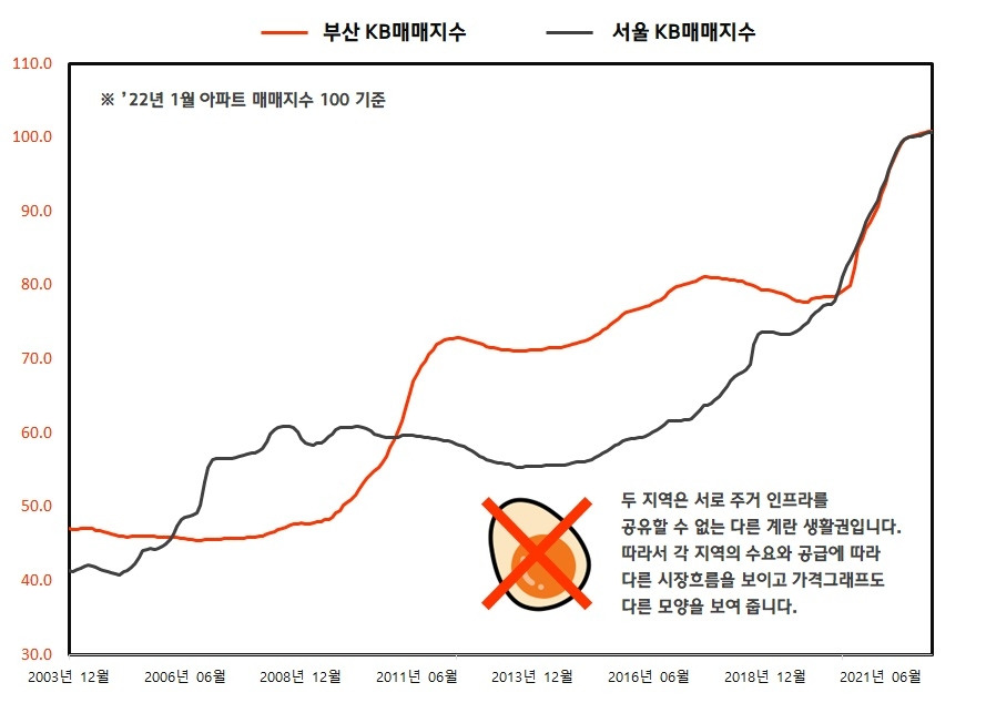 부산의 집값을 따라 같은 흐름을 타고 움직이던 양산의 집값과 달리 별다른 연관성 없이 각자 움직이는 게 보이시죠. ● 왜 이런 결과가 나오는 걸까요? 하나의 생활권의 큰 시장 흐름을 결정짓는 결정적인 요소는 매매심리인 수요와 신축 아파트 공급량입니다. 부산의 매매심리와 신축 아파트 공급량이 서울 지역 사람들에게는 그다지 큰 영향도 끼치지 않기 때문에 두 지역의 부동산 시장 온도는 다를 수밖에 없습니다. 두 지역이 어쩌다 같이 오르고 내린 시점이 겹쳤다 하더라도 우연의 일치일 뿐 각자의 시장 흐름을 따로 가지고 간다는 사실은 부정할 수 없습니다. (그래프에서 오른쪽으로 갈수록 모양이 비슷해 보이는 것은 자료의 출처 측인 KB부동산 측에서 2022년 1월의 매매 가격을 지수 100으로 일치시켜놨기 때문에 오는 현상입니다.)