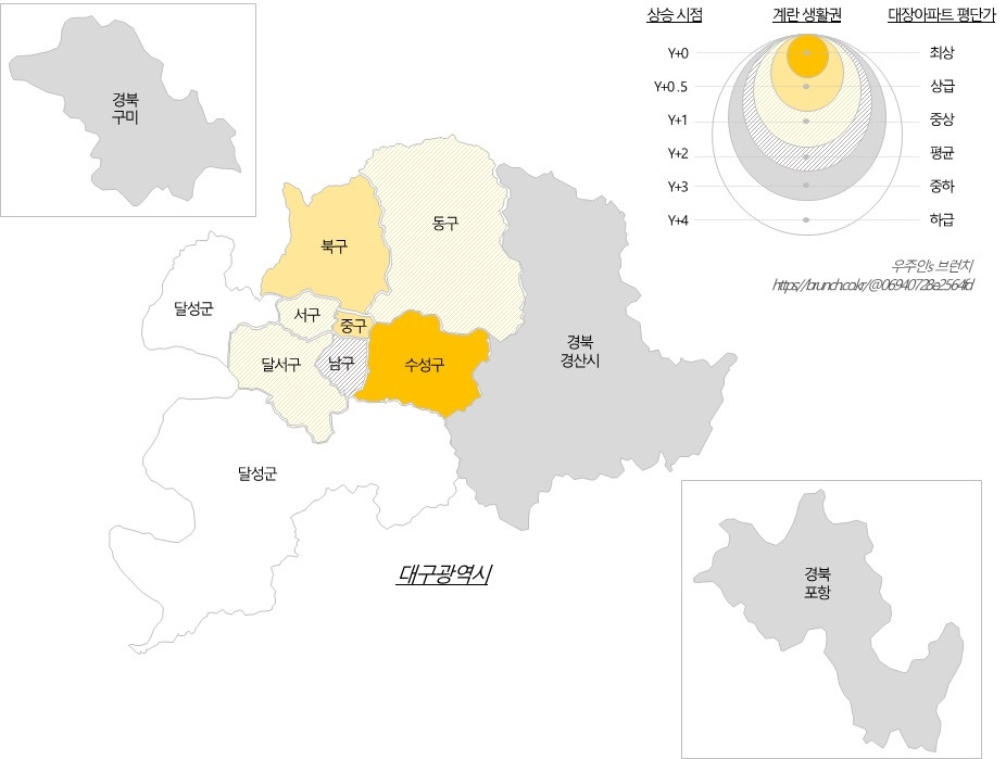 위에 지도에 보이는 지역들 중 아무 색깔도 칠해지지 않은 (흰색) 지역은 투자경험이 많지 않다면 가급적 투자를 지양하시길 권해드립니다. 핵심지 아파트의 가격이 상승한 이후 흰자 바깥쪽 지역 아파트의 가격이 상승하기까지 4년에 가까운 시간이 걸렸으며, 수요가 두텁지 않아 계란생활권 안쪽의 대규모 공급이 들어오면 가장 먼저 타격을 받을 것이기 때문입니다.
