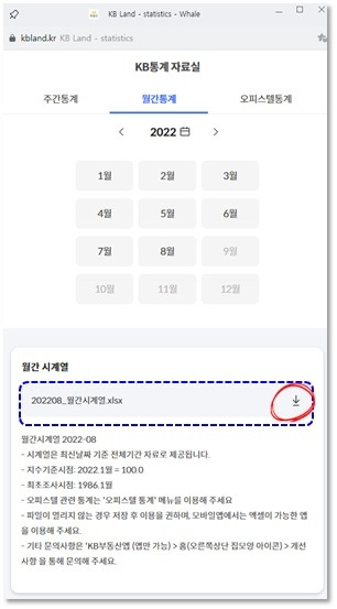 KB통계를 누르시면 주간, 월간, 오피스텔 통계항목이 나옵니다. 그중 월간 통계를 클릭하고 아래 월간시계열의 최신 버전을 다운로드합니다.