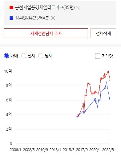 대장아파트는 일반아파트보다 먼저 상승하는 특징이 있다고 말씀드렸습니다. 이 특징을 이용해 내가 투자하려는 아파트는 얼마나 오를 수 있는지 확인할 수 있습니다. 전라도 광주를 예로 들어보겠습니다. 제가 광주광역시 서구의 신축 아파트인 '상무SK뷰'에 투자를 고려하고 있다고 가정해보겠습니다. 서구 치평동도 상당히 좋은 입지에 속하지만 광주광역시의 진정한 대장 입지는 남구의 봉선동입니다. 이유는 역시 지방광역시에서 빼놓을 수 없는 핵심 입지요소인 '학군'입니다. 전용 84면적을 기준으로 할 때 남구 봉선동의 아파트 중 '봉선제일풍경채엘리트파크'를 대장아파트로 생각하고 두 아파트의 가격을 비교해보겠습니다.