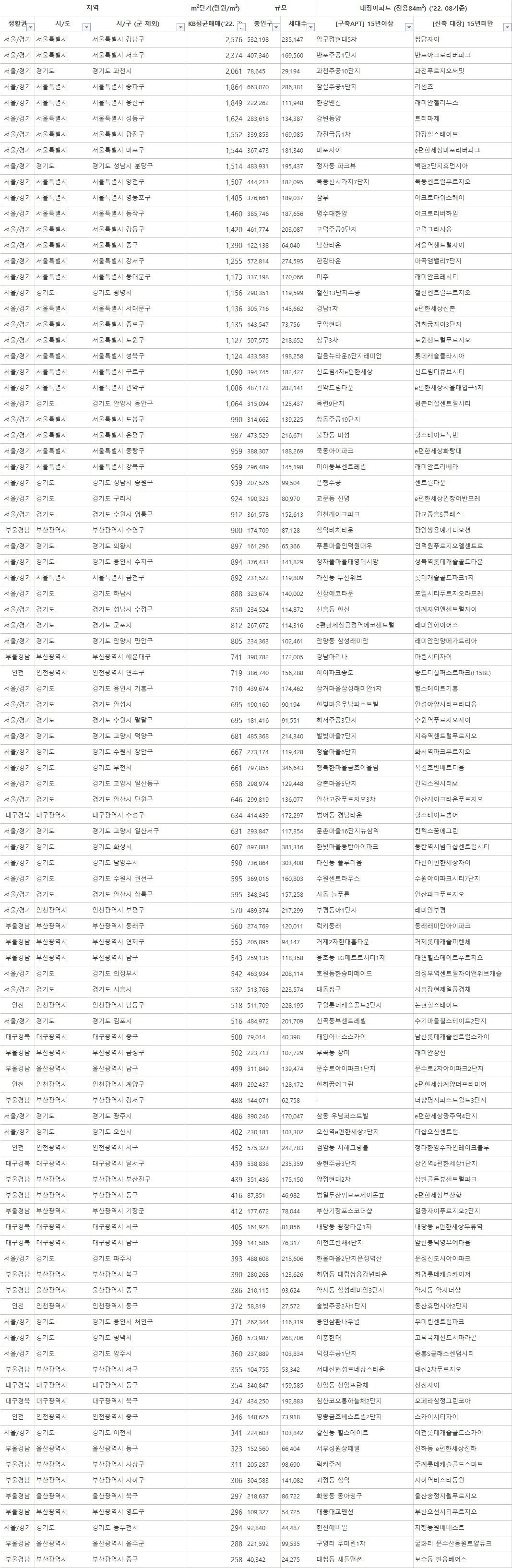 전국 주요도시 규모 및 평단가 간소화 테이블 (출처 : 자체 제작)