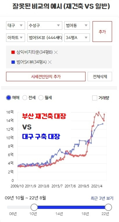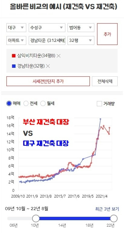 ●첫 번째 기준은 비슷한 특성의 아파트끼리 비교하는 것입니다. 부산의 대장은 재건축아파트인 '삼익비치'로 선정하고 대구의 대장아파트는 일반 구축인 '범어SK뷰'로 비교하면 대구의 범어SK뷰가 저평가됐다고 오판할 수 있습니다. 이 경우, 대구의 대장아파트도 재건축아파트인 '경남타운'과 비교해야 제대로 된 가격평가를 할 수 있습니다.