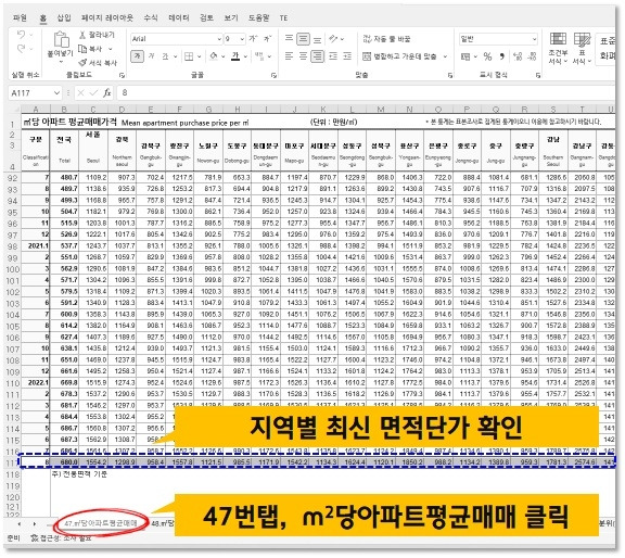 다운로드한 엑셀을 열고 '47번탭 m2당아파트평균매매'를 열면 아래 이미지와 같은 화면이 나옵니다. 제일 아래 열을 보면 지역별 최신 면적단가를 볼 수 있습니다. 해당 데이터는 광역시 외 지방도시의 면적단가가 없다는 것과 데이터를 쌓은 기간이 길지 않다는 한계점이 있으나, 다른 부동산 플랫폼을 보며 일일이 면적단가를 확인하는 것보다 훨씬 빠르게 넓은 지역의 면적단가를 한 번에 확인할 수 있다는 장점이 있습니다.