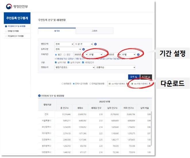 전체 시군구의 인구와 세대수를 알아보기 위해 조회 기간을 최신으로 맞춰놓고 엑셀 파일을 다운로드하시면 전국의 인구 규모를 한 번에 보실 수 있습니다. 아래 화면에 보이는 인구수와 세대수를 보면 부산과 대구, 인천을 한 묶음으로, 광주와 대전을 한 묶음으로 나누어 가격 비교를 해볼 수 있겠네요. 이외에도 인구수 100만을 기준으로 경기 수원과 경남 창원을 비교할 수도 있고 인구수 80~90만을 기준으로 충남 천안&아산과 충북 청주를 비교대상으로 하여 대장아파트끼리 과거 10년간 가격을 비교해보면 어떤 지역이 상대적으로 저평가되어있는지 알 수 있습니다.