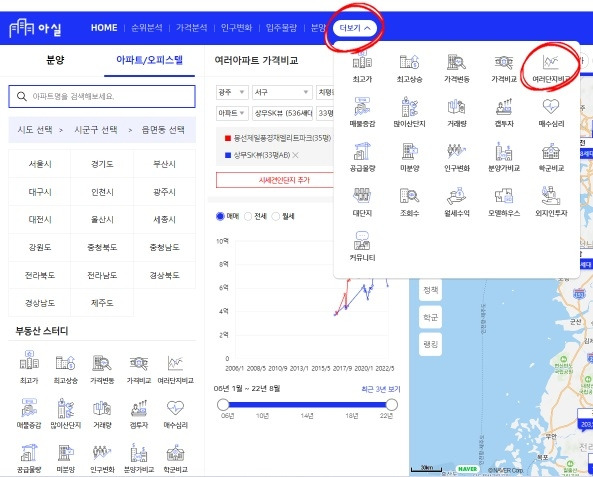 아실 접속 후 오른쪽 상단에 '더보기'를 클릭하시면 '여러 단지 비교' 메뉴가 나옵니다.
