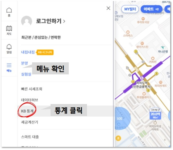 전국 평단가의 경우는 KB부동산의 월별 데이터를 다운받아 사용하시면 편리하게 정리하실 수 있습니다. 먼저 KB부동산 사이트에 접속하셔서 메뉴를 클릭하시고 'KB통계'로 들어가세요.