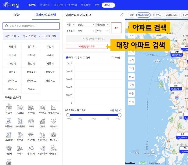 아실(아파트 실거래가) 앱을 이용하면 실거래를 기준으로 전국의 여러 아파트 단지 가격을 자유롭게 비교할 수 있습니다. 총 10개의 아파트의 시세를 한꺼번에 비교 가능하다는 장점이 있습니다.