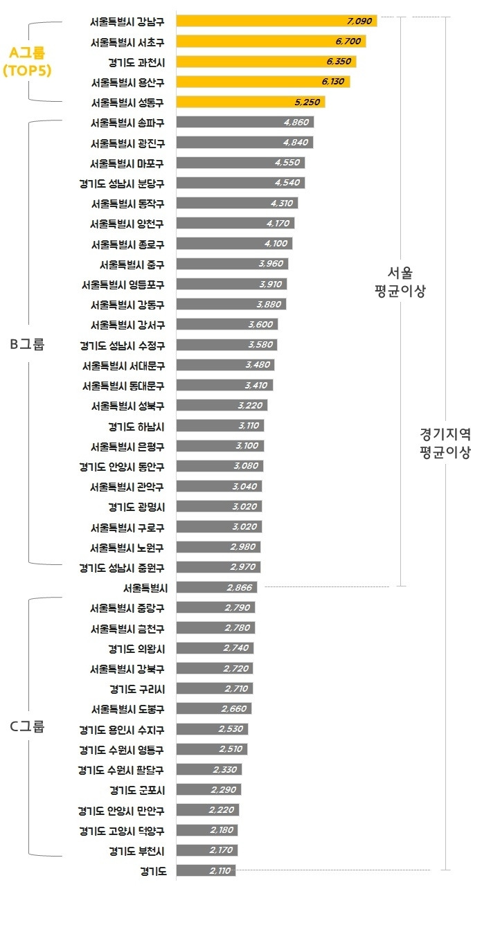첫 번째로 안전자산이라고 생각할 수 있는 서울/경기 지역의 평단가 상위 지역을 뽑았습니다. 이 지역들을 다시 집 값이 비싼 지역부터 A, B, C 그룹으로 나누었습니다.