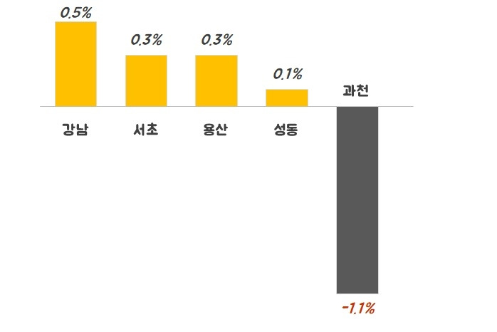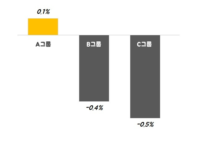 A그룹을 제외한 B, C그룹은 짧은 시간에 비교적 큰 폭의 조정을 받은 반면 A그룹의 집값은 0.1% 상승하며 보합 수준의 시장 흐름을 보여주고 있습니다. 사실 3개월간 0.1%는 상승이라고 이야기하기에는 무리가 있는 수치입니다. 1달에 0.1%~0.2% 사이의 상승이 나와야 해당 지역의 집값이 전반적으로 오르고 있구나라는 게 느껴지니까요. 하지만 B, C그룹과 비교했을 때, 가격 변화의 차이가 있다는 것만은 확실히 알 수 있습니다. 그럼 A그룹엔 무슨 일이 일어나고 있는 것인지 한번 더 자세히 지역별로 살펴보겠습니다.