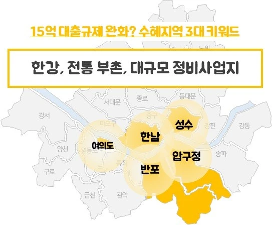● 대내외적으로 불안한 경제상황 속에서 안전자산으로 돈이 몰리는 초양극화 현상이 지속되고 있습니다. 이번 15억 초과 주택 담보대출 규제완화는 초양극화 현상의 촉매제로 작용될 것이라 예상됩니다. ● "한강", "부촌", "대규모 정비사업지" 3가지 키워드를 가지고 수혜지역을 찾아보고, 앞으로의 시장 흐름을 지켜보면 향후 주거 수요의 트렌드를 확인하실 수 있는 좋은 기회가 될 것이라 생각됩니다,
