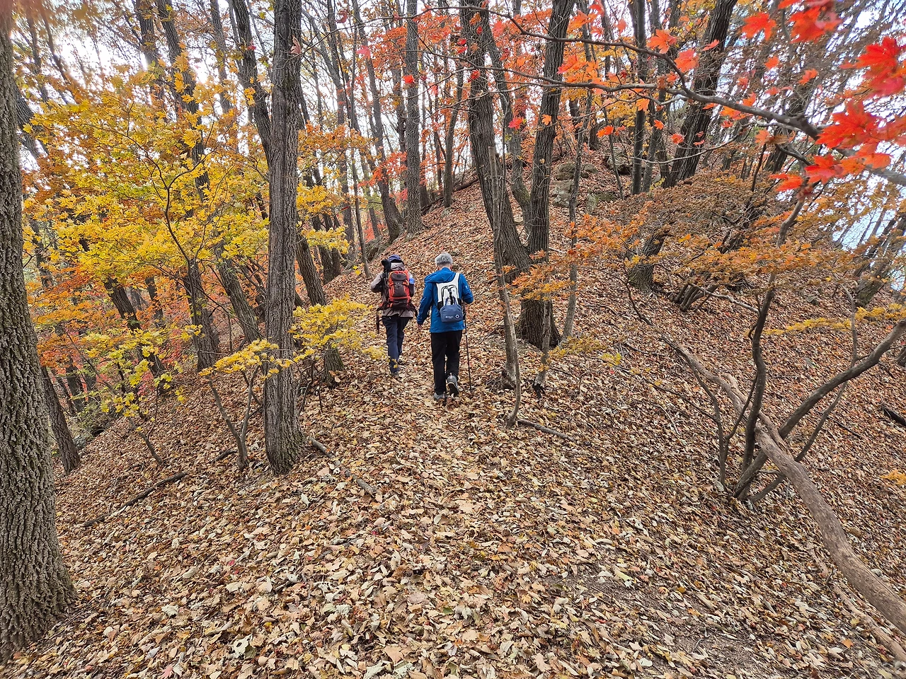 간단히 형님들과 점심을 김밥, 간식, 과일 등으로 간단히 때우고 호명호수를 한바퀴 돌아본 후 호명산 방향으로 산행을 계속했다. 호수쪽에는 관괭객들이 꽤 많았지만 산행코스에는 보이는 등산객들이 거의 없어 늦가을도 아직 아닌데도 낙엽소리가 사각사각거리며 우리의 발걸음을 재미있게 해 주었다.