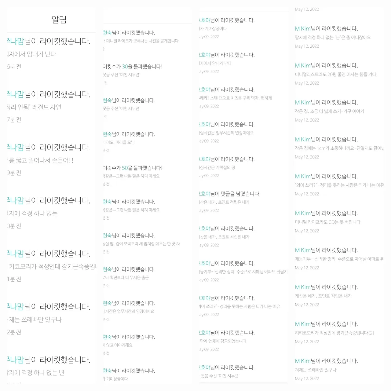 70일 동안 브런치를 하면서 가장 기뻤던 순간들 중 하나는 몇 분의 시간차를 두고 올라오는 동일인의 라이킷 알림이다. 누군가가 지금 나의 글을 하나하나 읽어가고 있음을 알려주는 알림이 오면 두근거릴 정도로 설렌다. 한 자리에서 한 사람의 글을 계속해서 찾아 읽는 것은 상당한 정성을 들여야 할 수 있는 일이라는 것을 알기에 기쁨이 더하다. 글을 읽어가는 2-4분 정도의 텀을 두고 라이킷 알림이 하나씩 하나씩 울리면 다른 일에 집중하지 못하고 그 알림을 주시하고 있다. 아침에 자고 일어나 습관처럼 브런치를 열었을 때 한 페이지에 한 분의 라이킷으로 채워진 화면을 본 순간엔 눈물이 나서 인공누액을 넣을 필요가 없었다. 브런치 북의 1화부터 차례로 라이킷 알림이 오더니 다음 날 브런치 북 완독자 1명이 늘어난 것을 확인할 때 느끼는 그 기쁨, 다른 어디에서도 그렇게 큰 기쁨을 느낄 수가 없다.