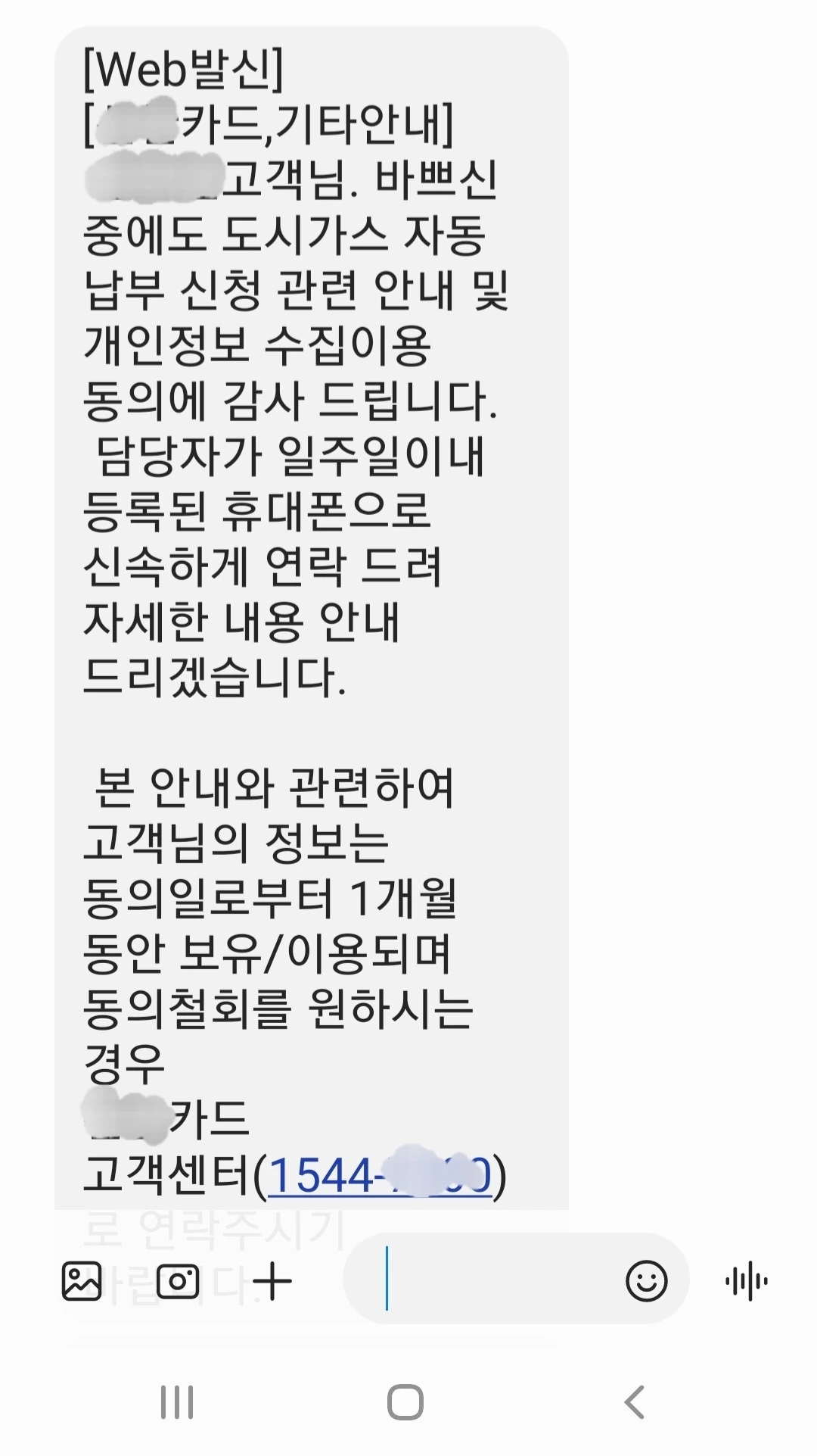 이게 뭔가. 도시가스? 개인정보 동의? 나는 대부분 정보 서비스는 미수신으로 해놓는다. 통화하며도시가스의'도'자도 꺼내지 않았는데 이런 문자가 오나. 순간 기분이 안 좋지만 다시 전화해서 정정해달라 요청할 에너지가 없다.