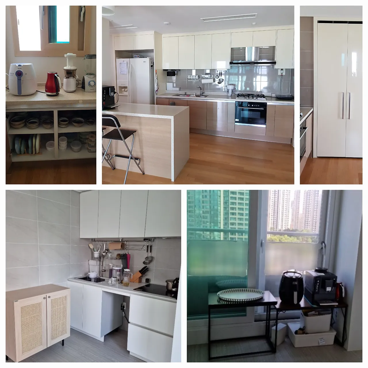 개수는 같은데 크기 차이가 어마 무시하다.예전 집의 한쪽 긴 벽면은 모두 부엌이었다. 커다란 상하부장 앞에 큰 아일랜드 식탁, 오른쪽에 팬트리룸 왼쪽에는 보조 수납장이 있었다. 주방 가전들을 줄지어 놓고 써도, 그릇을 진열하듯 두어도, 재료를 여기저기 늘어놓고 조리해도 여유로운 공간이었다.