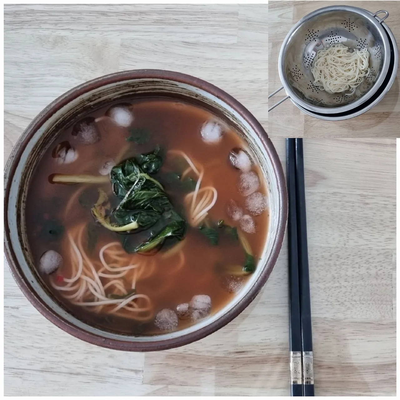 멸치장국을 8배의 물로 희석하고 얼음을 띄우는 것으로 육수 준비 끝..