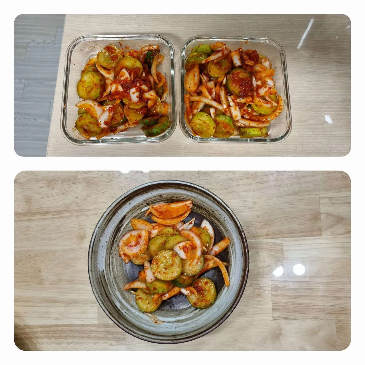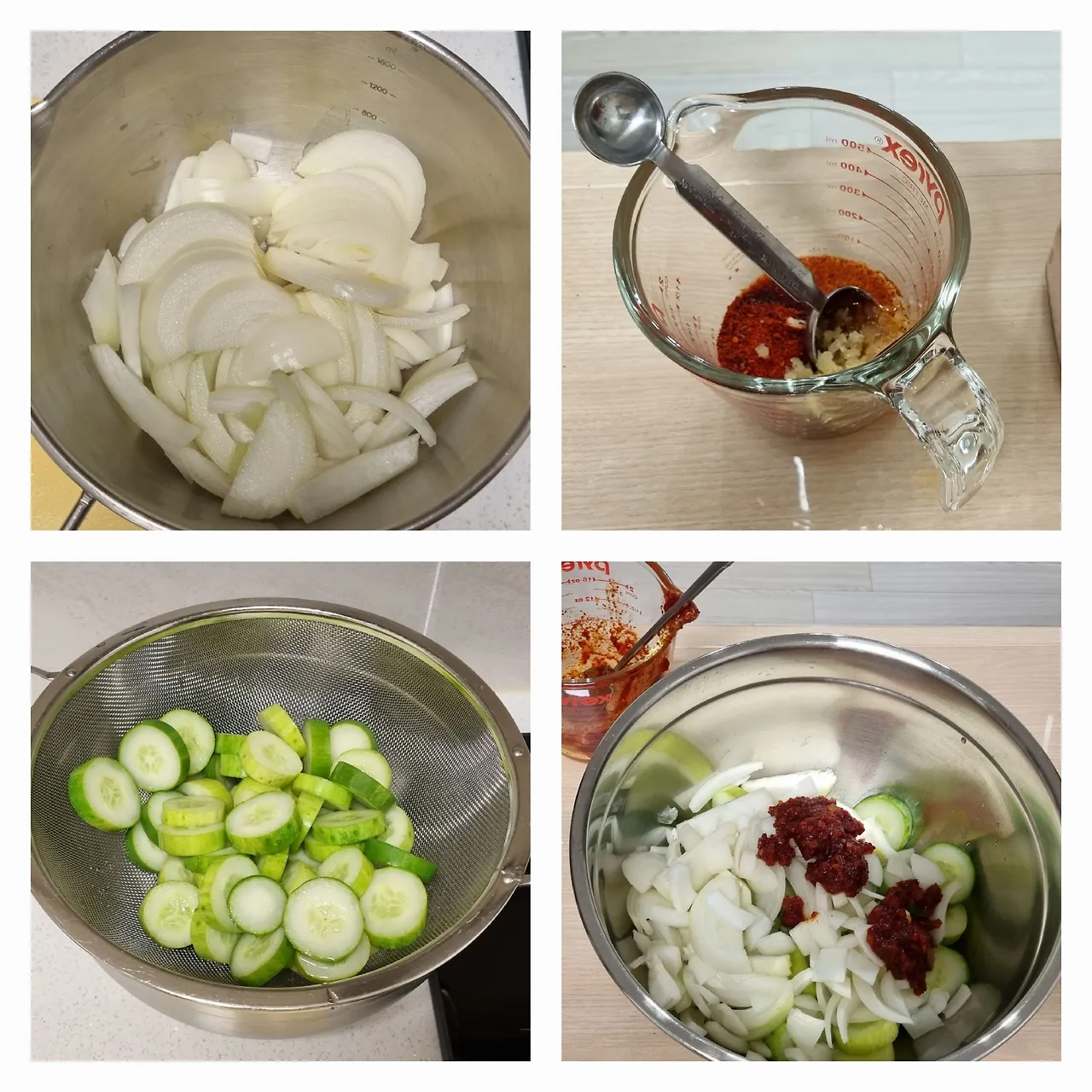 체를 도마에 올려 물기를 더 빼는 동안 오이를 담가놓았던 큰 그릇을 물로 헹구고 물기를 닦는다. 설거지는 최대한 적게. 그 그릇에 물기를 뺀 오이와 양파 양념장을 넣고 살짝 버무려주면 오이 겉절이 완성.
