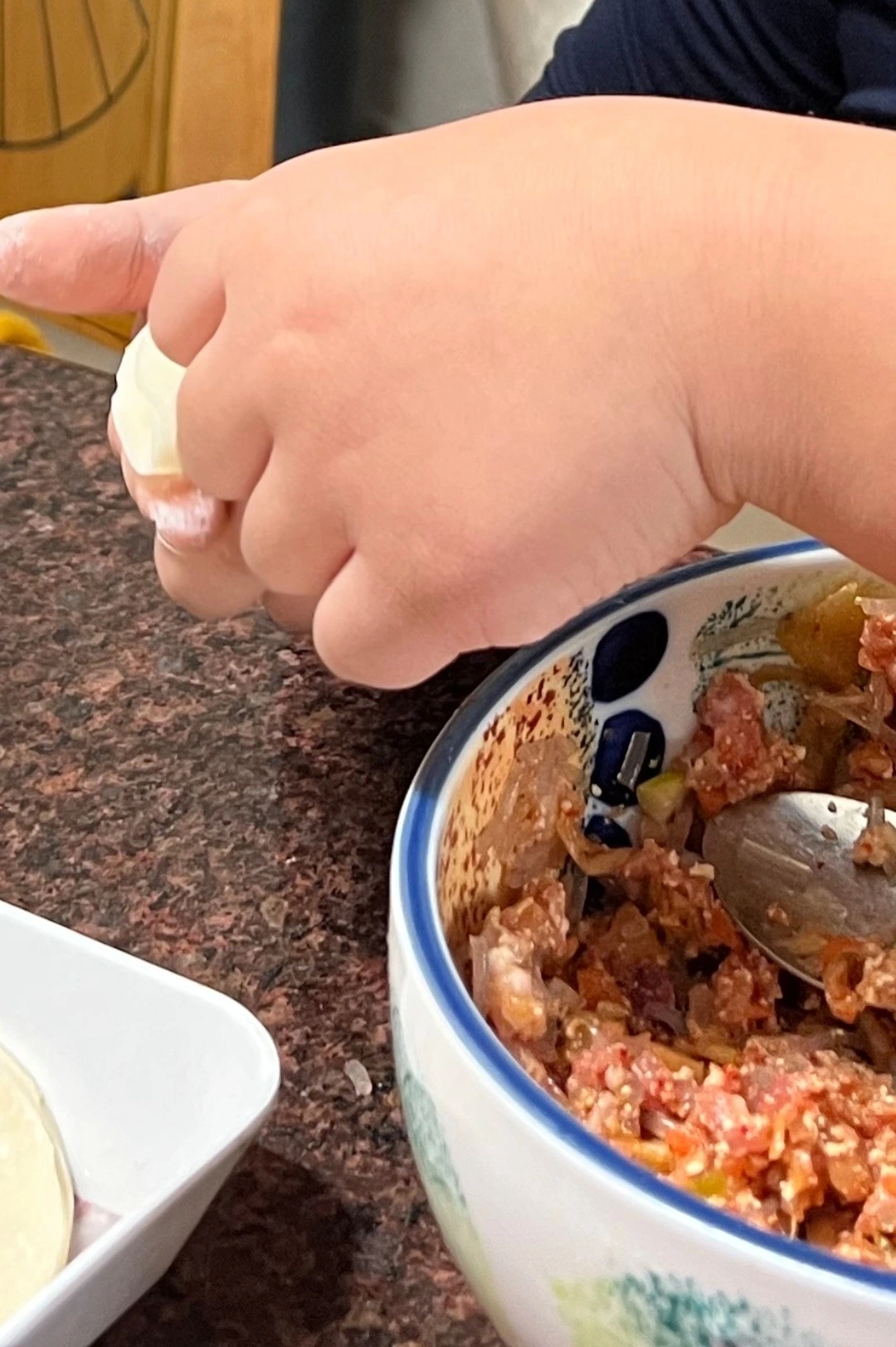둥근 만두를 빚고 있는 조카의 손. 요철이 없다