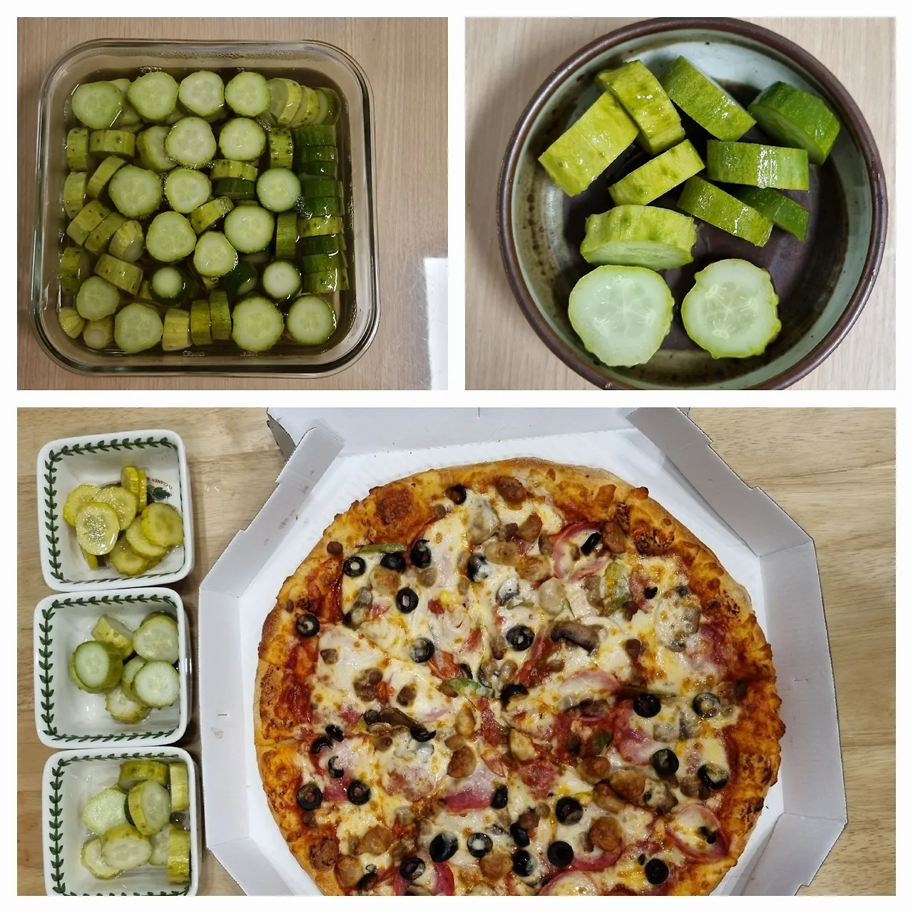 피자 한판에 피클 세개 플렉스. 제일 위의 피클은 피자와 온 피클, 밑 두개가 수제 피클