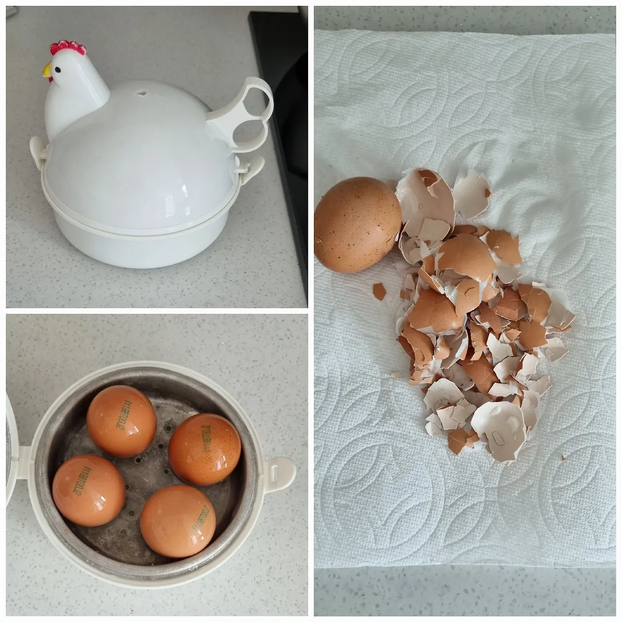 계란만 삶았다 치면 자꾸 터지는 바람에 3천 원을 주고 산 계란찜기는 전자레인지에 넣고 완숙은 9분 30초, 반숙은 7분 정도면 예쁘게 계란이 쪄진다. 신혼 때 구입했는데 닭 볏의 빨간색이 좀 벗겨졌지만 여전히 작동이 잘 된다.4개씩 세 번을 돌리며 한 번은 완숙, 한 번은 반숙, 한 번은 그 사이로 익혔더니 어떤 것이 걸릴지 몰라 은근히 재미나다. 물론 이런 게 없어도 냄비에 넣고 삶으면 된다.