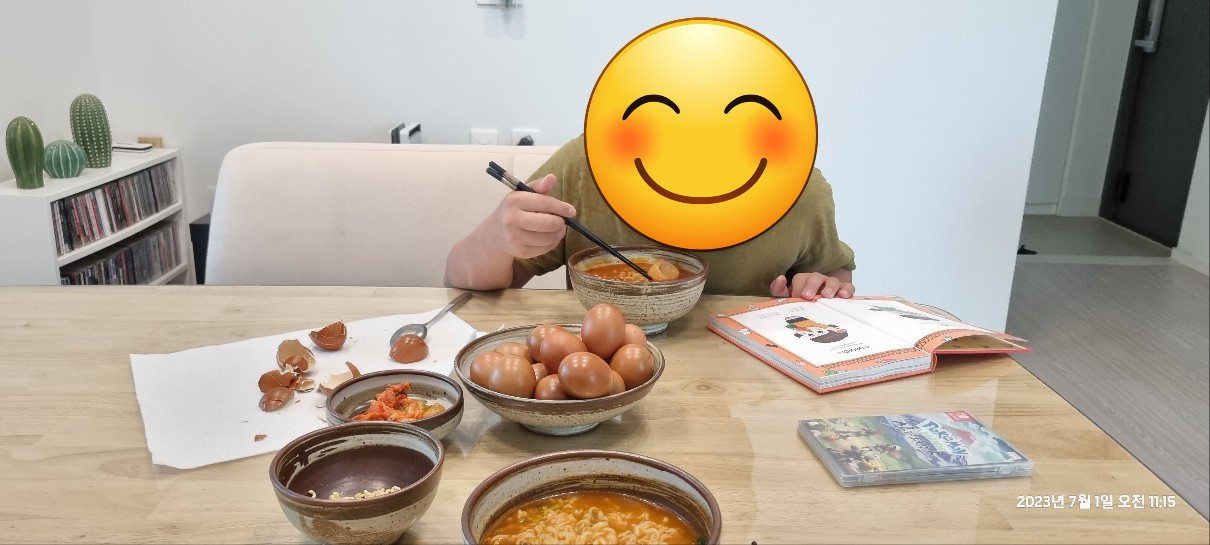 구운 계란 껍데기를 널브러트려 놓고 좋다고 낄낄대며 책장을 넘기는 아이 옆에서 조용히 뒷정리를 한다. 돈을 내고 이용하는 건데 잔소리는 당연히 금물이다. 라면과 컵라면을 하루에 먹는다고 해도 심호흡을 내쉬며 바로 조리에 들어간다.