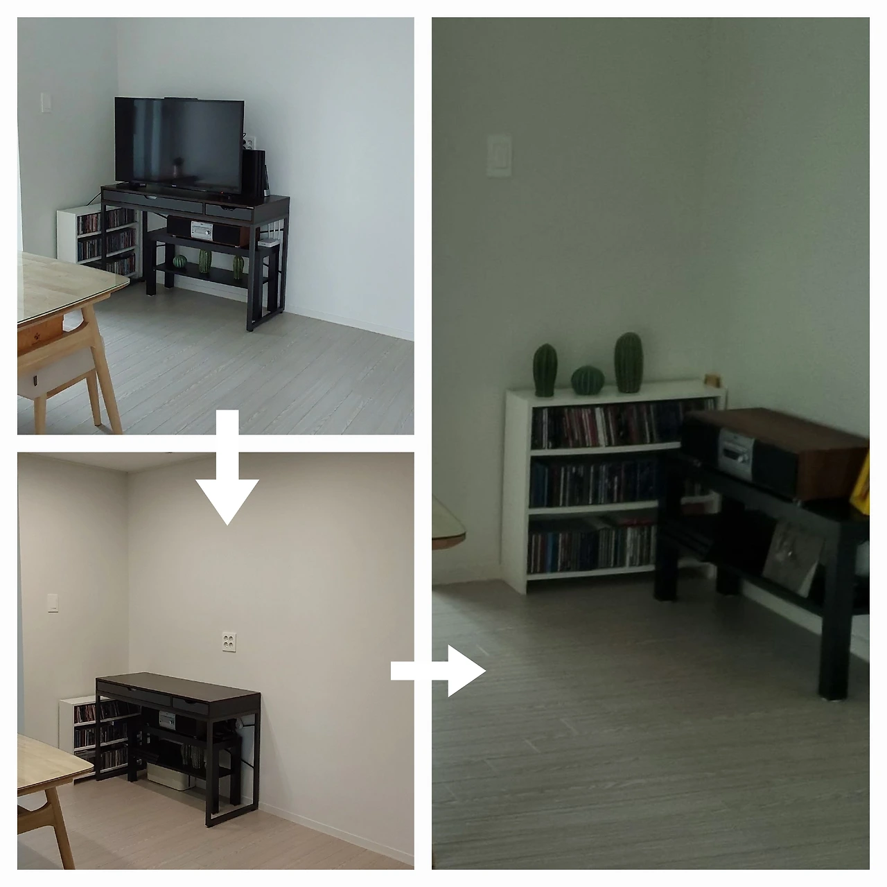 있으면 편하겠지만 이 작은 집에서는 책상이 더 튀어나온 단 15cm가, 작은 테이블이 차지하는 공간의 비중도 너무 크다. 소파를 들이며 훅 좁아진 빈 공간을 둥지 두 개를 없애며 다시 확보한다.