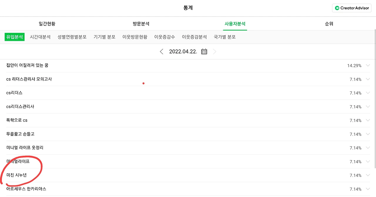 오늘은 며칠 만에 블로그 통계를 좀 자세히 들여다봤는데, 사용자 분석의 '유입 분석'을 보다 혼자 육성으로 빵 터졌다.