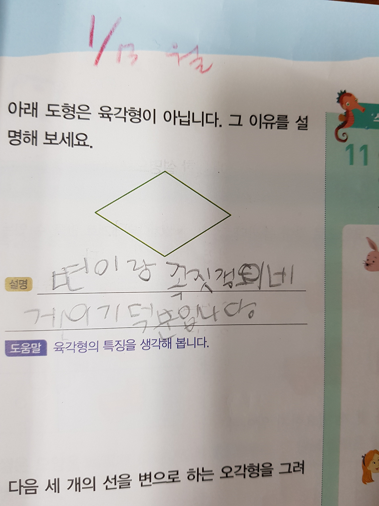 몇 년 전, 제시된 도형이 육각형이 아닌 이유를 묻는 문제에 아이는 또박또박 "변이랑 꼭짓점이 네게이기 덕분입니다"라고 적었다. '너 때문이야'라는 말은 듣는 사람 마음을 아프게 하는 말이니까 쓰지 말자고 했던 것 같다. 대신 '덕분에'를 쓰면 좋다고 했더니, 이렇게 예쁘게 답을 적어 놓았다. 이건 무조건 정답이다.