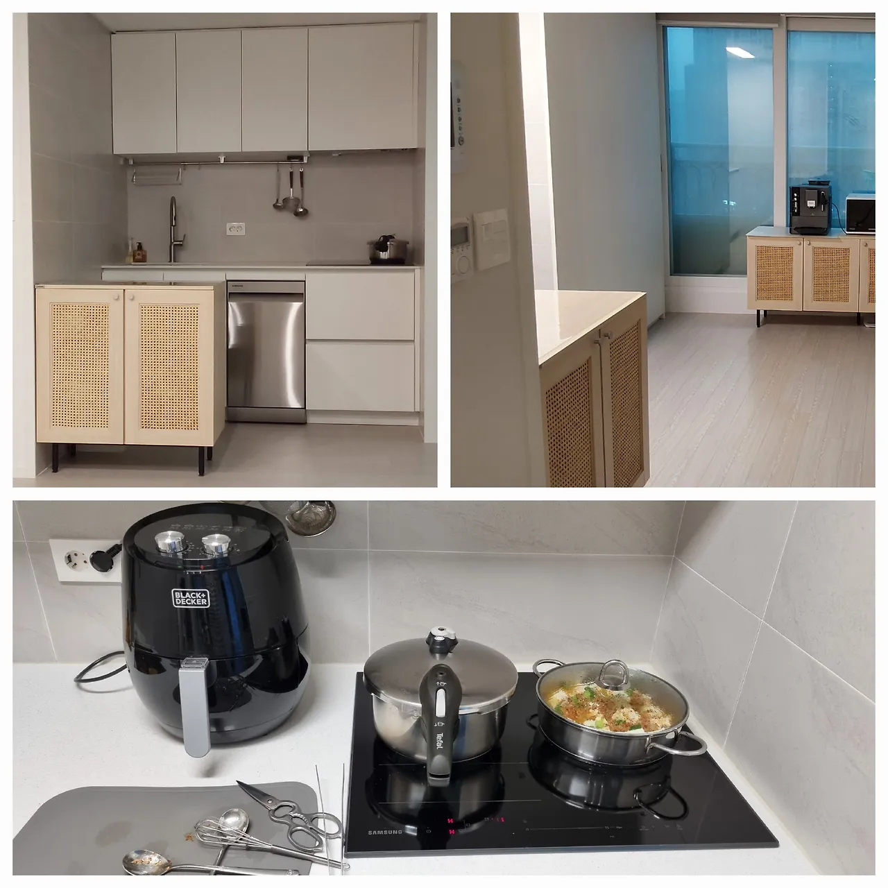 수납도 수납이지만 조리공간이 턱없이 부족했다. 인덕션과 개수대 사이 거리는 딱 3.5L 용량 에어프라이어 하나만큼이다. 드넓은 아일랜드 식탁은 없다. 상부장 오른쪽 가장 큰 문 안에 후드가 들어있고 싱크볼 하부에는 보일러 배관이 들어있다. 그 옆은 식기세척기니 사실상 수납공간은 상부장 한 칸, 하부장의 서랍 두 개가 전부다. 가스배관과 보일러 배관함을 활용해 짜 넣은 붙박이장 일부에 부엌살림이 들어간다.