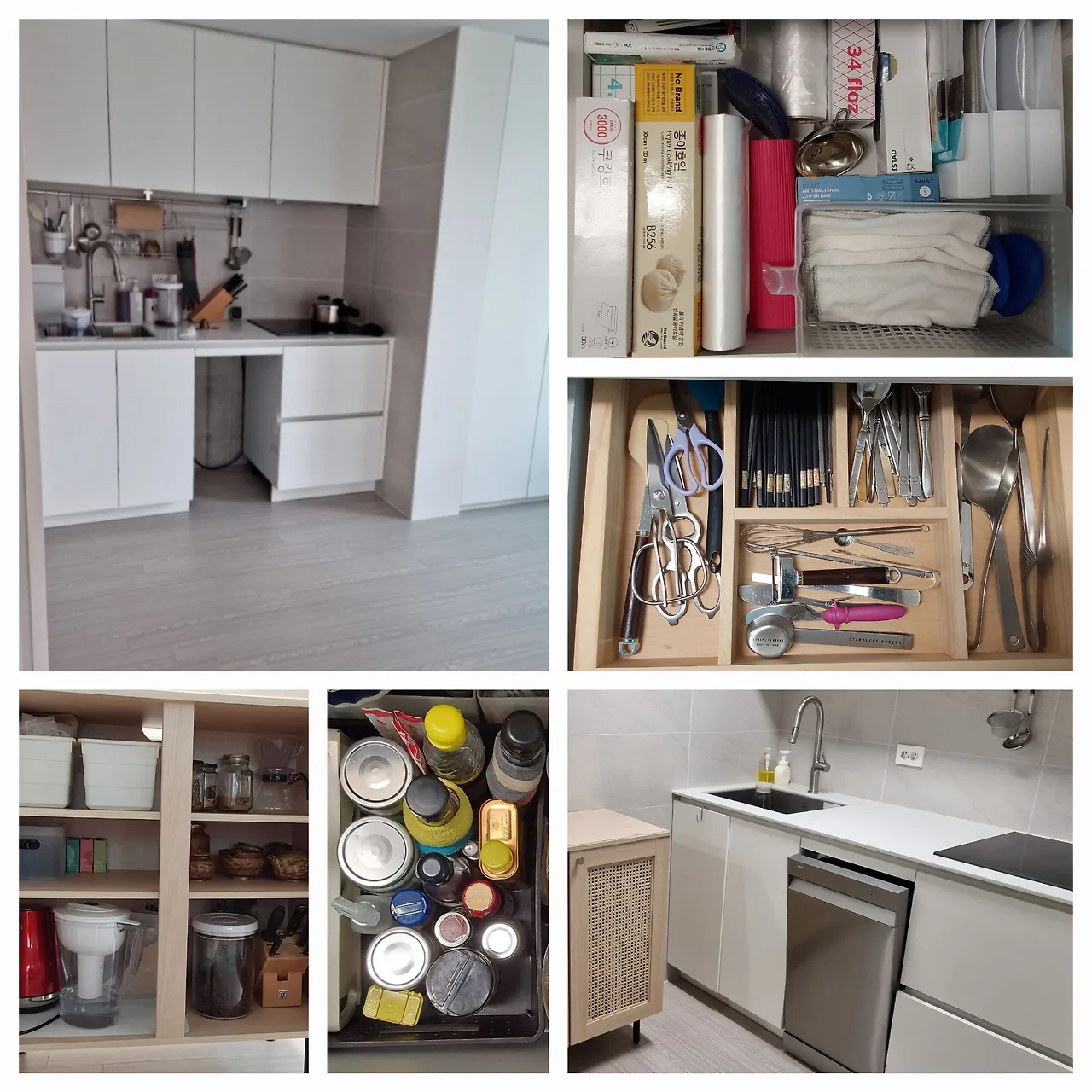 부엌의 모든 것을 다 꺼내 처음부터 다시 정리한다. 밖에 나와 있는 것들을 최대한 안으로 넣어싱크대와 수납장 상판을 비운다.