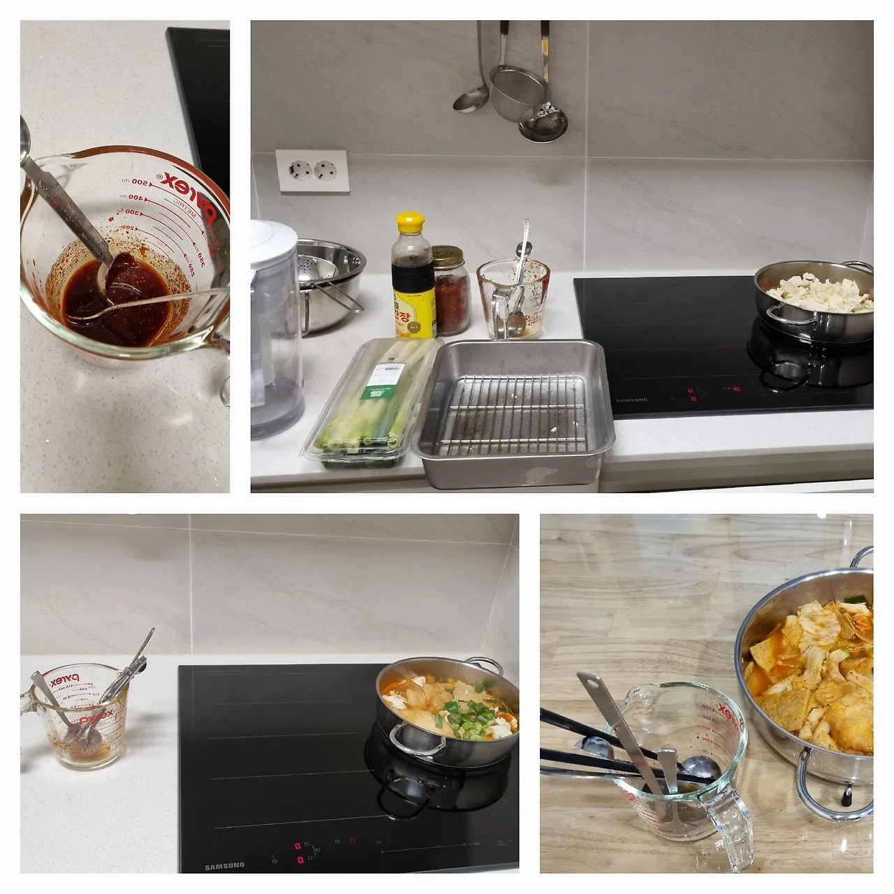양배추를 담았던 스텐 바트 하나에도 훅 좁아지는 너비지만 재료를 다 넣고 끓기를 기다리며 싹 치우고 나면 계량컵 하나만 남는다. 계량컵은 식탁으로 그대로 이동