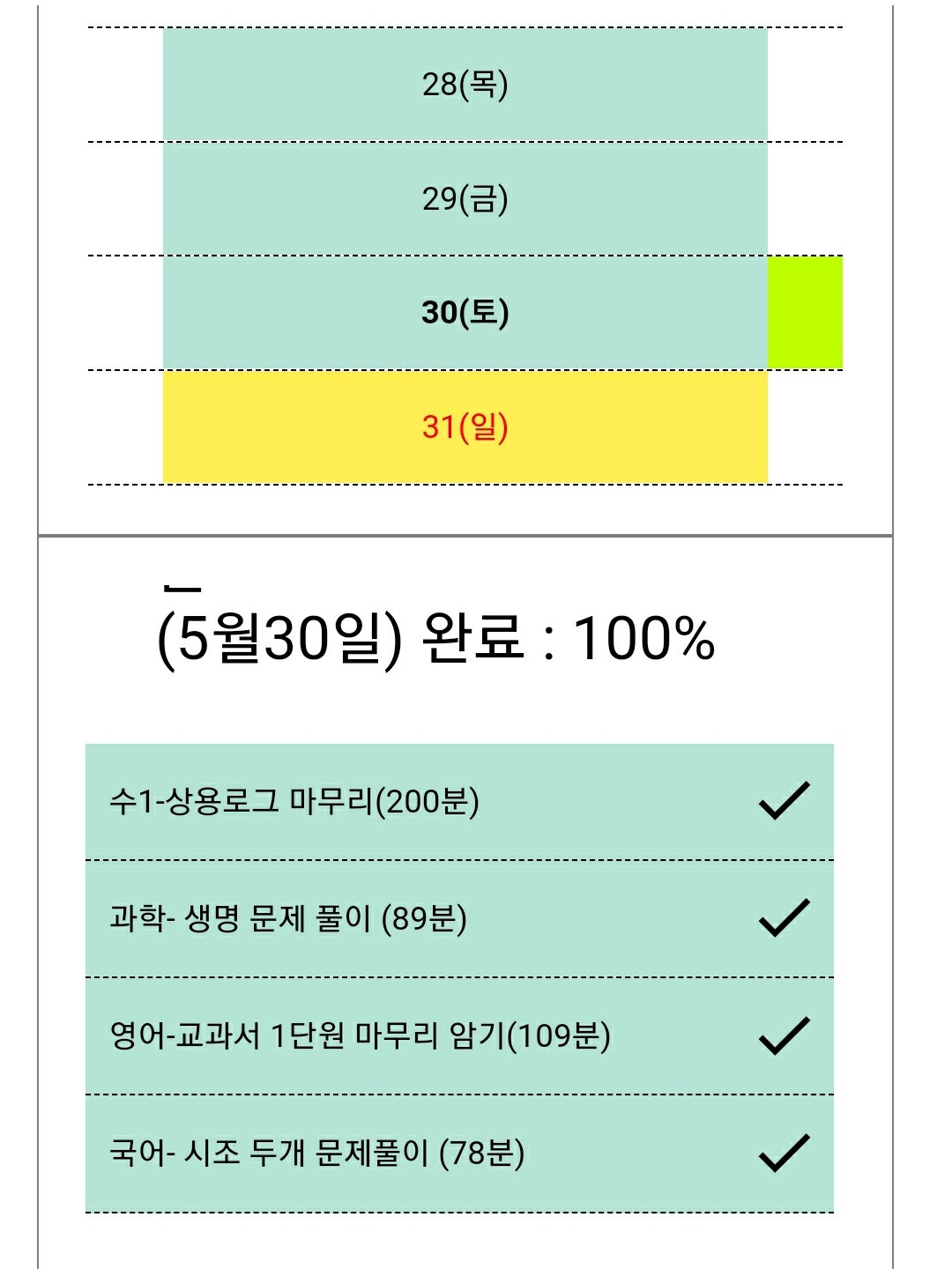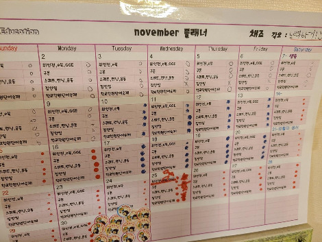 플래너 설명-모두 해낸것-그린, 하다 만 것-노랑, 손도 못댄 것- 핑크로 처리 되는 것을 볼수 있다.